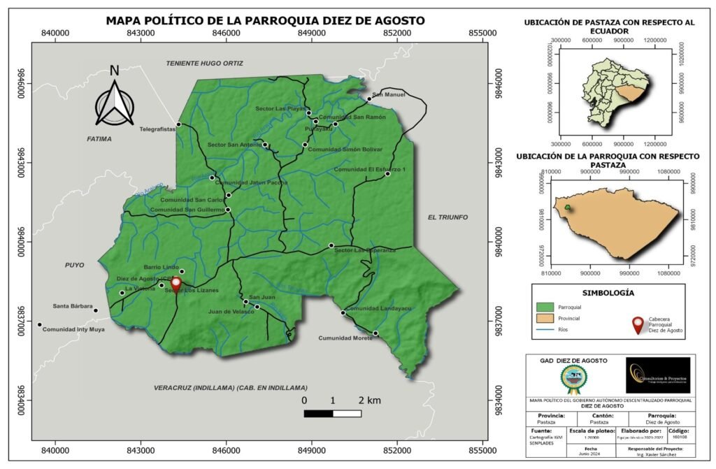 El Gobierno Autónomo Descentralizado Parroquial Rural Diez de Agosto, se encuentra localizada al oeste entre las parroquias de Fátima y la ciudad de Puyo, fue creada el 29 de noviembre de 1967 Según el Registro Oficial No. 263.