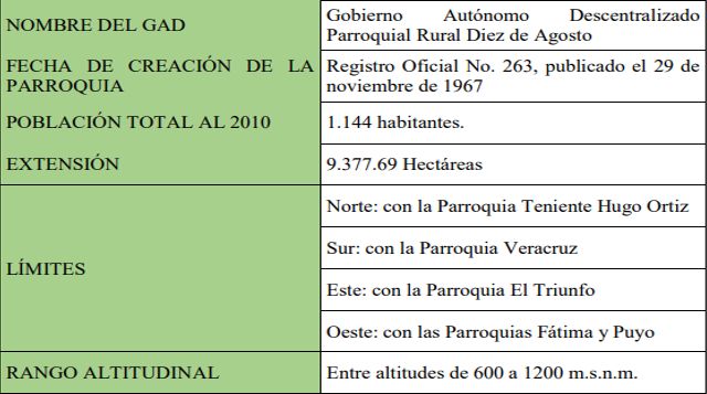 El Gobierno Autónomo Descentralizado Parroquial Rural de Diez de Agosto posee un local propio, en el cual funciona su área administrativa, desde este lugar el señor presidente y los señores vocales prestan los servicios de acuerdo a sus competencias a los pobladores que demandan de obras y servicios para mejorar sus condiciones de vida.